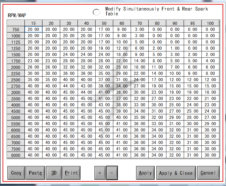 点火タイミングを設定するテーブルです。フロントとリアの点火タイミングをMAPに対して設定することができます。 |