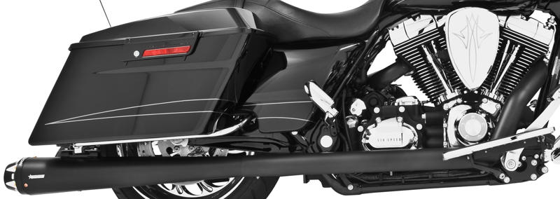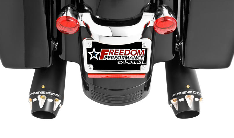 4.5インチの迫力のマフラーが奏でる重低音。クールなブラックヘッダーパイプの左右2本出しのフルエキゾーストシステムです。ツートーンカットのアルミ削りだしエンドチップ。O2センサーバング付きなのでクローズドループインジェクションにも対応。バッフルは、パワー重視のパフォーマンスバッフルと環境に配慮した静かな消音バッフル(Freedom Performance計測で85〜90db)から選ぶことができます。